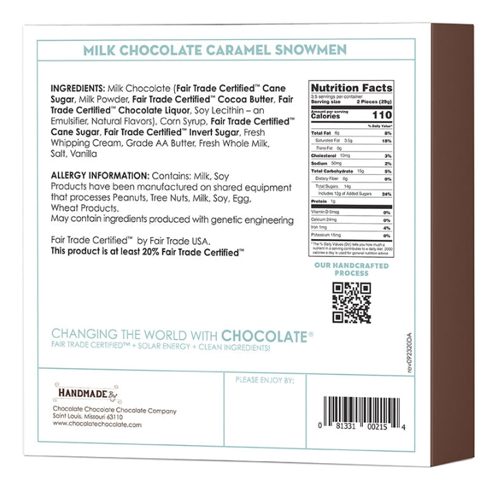 One of our MOST popular holiday confections. Our miniature milk chocolate snowmen are filled with our signature soft buttery caramel, made from cane sugar, Fresh whipping cream, butter, and Madagascar Vanilla; slowly cooked in copper kettles.