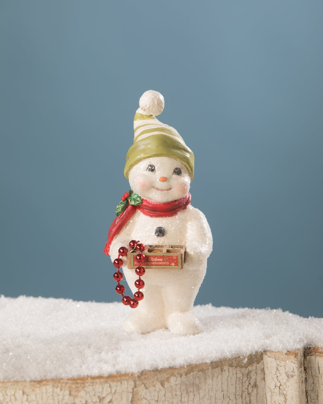 This cheery, retro inspired snowman by bethany lowe designs has a plucky smile with chubby cheeks. He wears a red scarf with a green and white striped hat and holds a pressed paper box of christmas ornaments in his hands as a red bead garland drapes off the box! Hand-painted resin, pressed paper, beads, and glitter.
