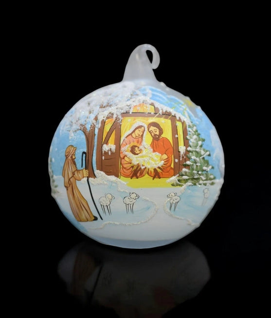 The main image is a nativity scene. You can see baby Jesus in the window. Such a delight. A beautiful winter scene with sheep in the foreground completes the design. You will love the detailing and how lightweight and beautiful this item really is.