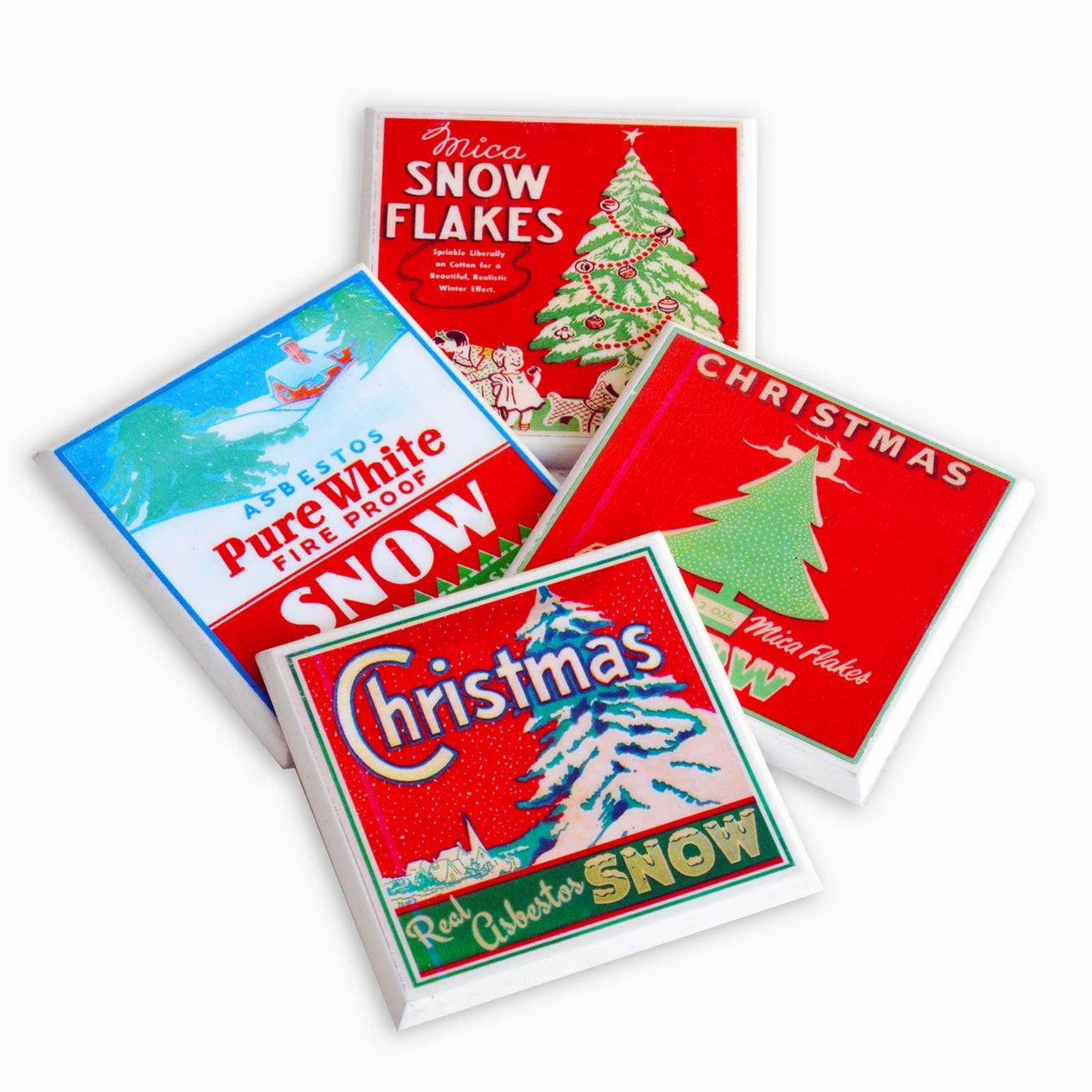 Let It Snow : Nothing says Christmas cheer like asbestos snow! These vintage box cover graphic bring back fond (and sort of alarming) memories of Christmas past. With an MDF base and a cork back every coaster is sealed with a waterproof, heat resistant resin (similar to that used to coat restaurant bars or tables) that provides a glossy finish and guarantees a long life. Dimensions: 3.5 x 3.5 x 2 in. Made in the USA.