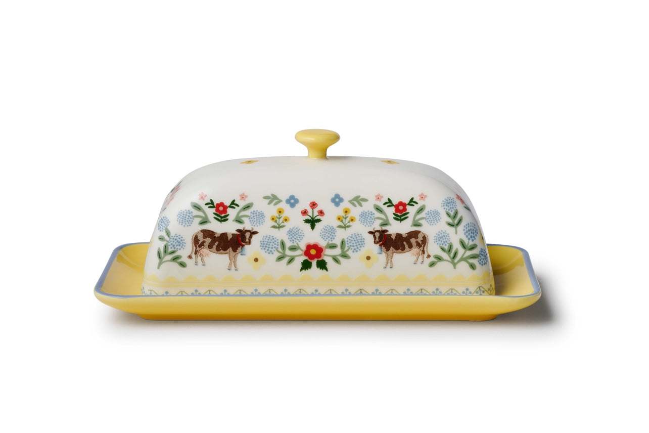 A charming yet functional kitchen accent, this porcelain butter dish features classic farm illustrations and cross stitch-inspired details.