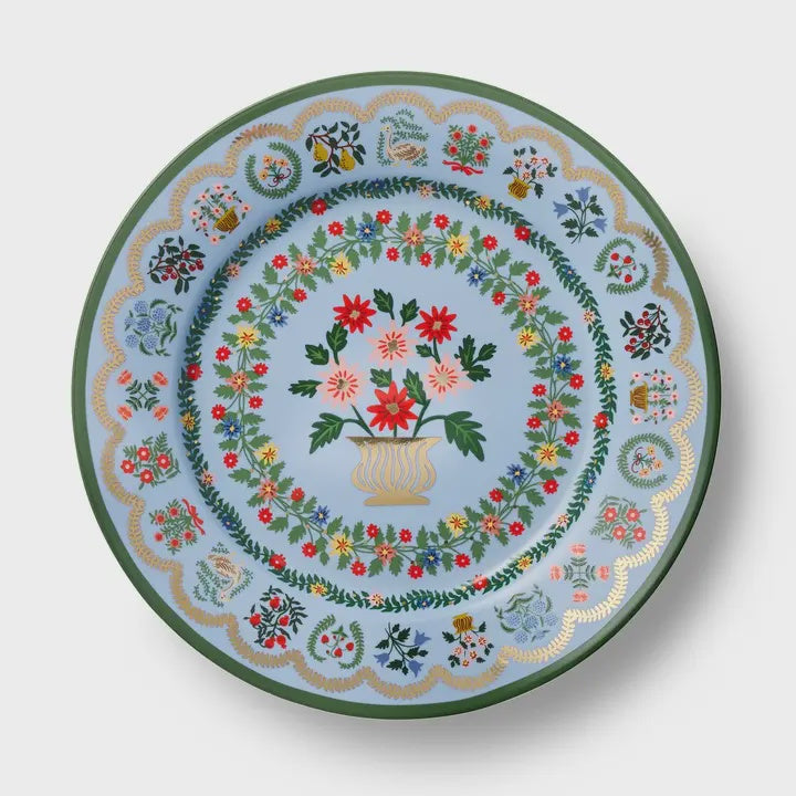 Detailed floral illustrations adorn these porcelain dessert plates, featuring four unique designs, shimmering gold accents, and gold-painted edges.