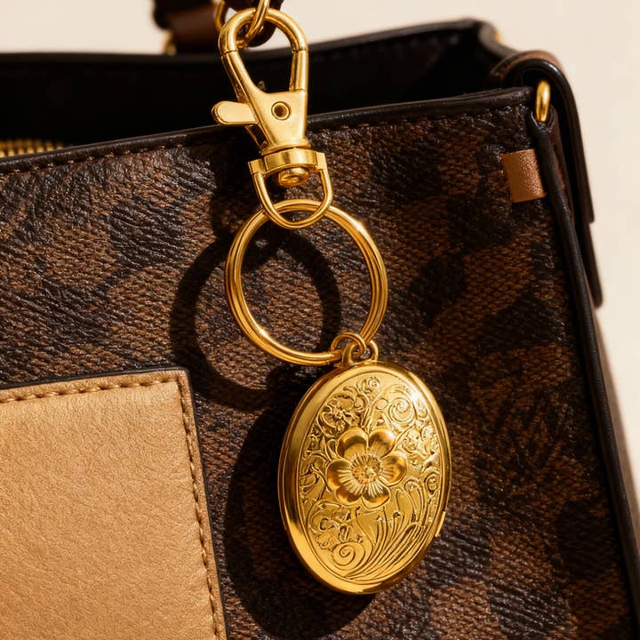 Capture a touch of vintage elegance with this floral oval photo locket bag charm. Whether used as a keychain or bag accessory, it effortlessly combines nostalgic floral design with a personal keepsake, making your everyday style uniquely yours. Made in the USA.