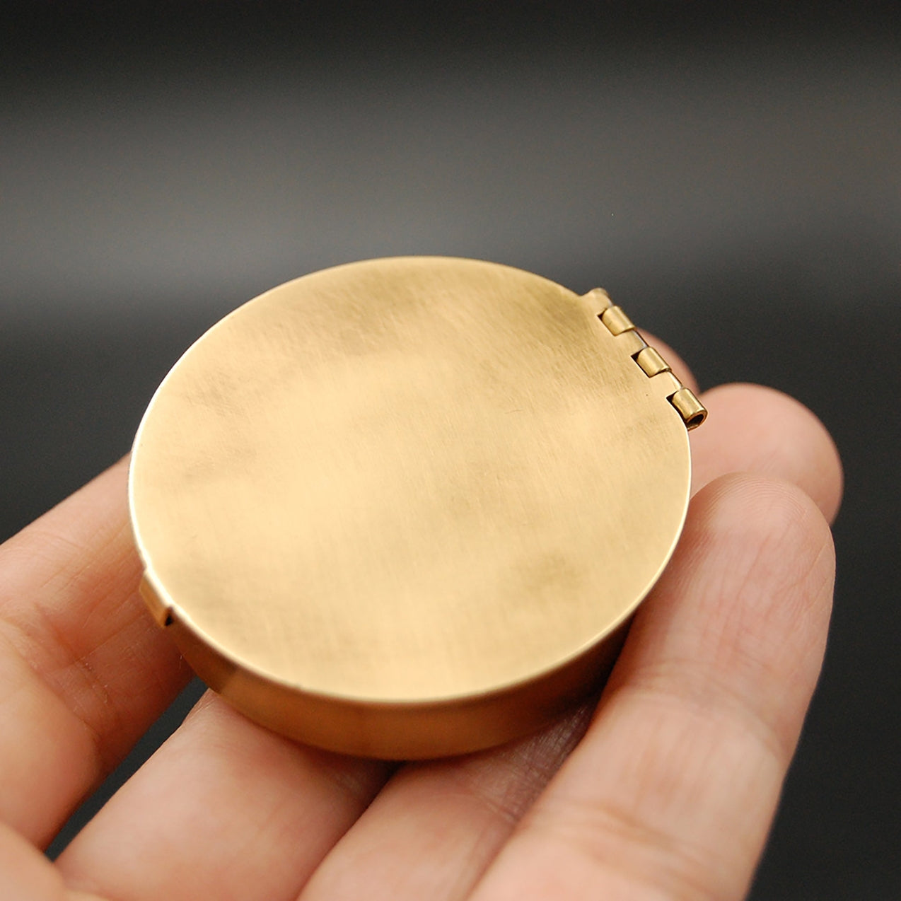 This box is 100% made in the USA and features a working hinge and clasp that catches when the lid is pushed down. It pops open with a simple push upwards with the pad of your thumb. It's such a cool, little item if you're looking for something unique! Box will be polished and antiqued and double coated with an eco-friendly sealant to preserve its finish, so no polishing will be required. Box is constructed from 100% raw brass and is uncoated on the interior, making it safe for temporary storage of supplements or meds, but please note this box is not air-tight or water-tight, so use your best judgement.