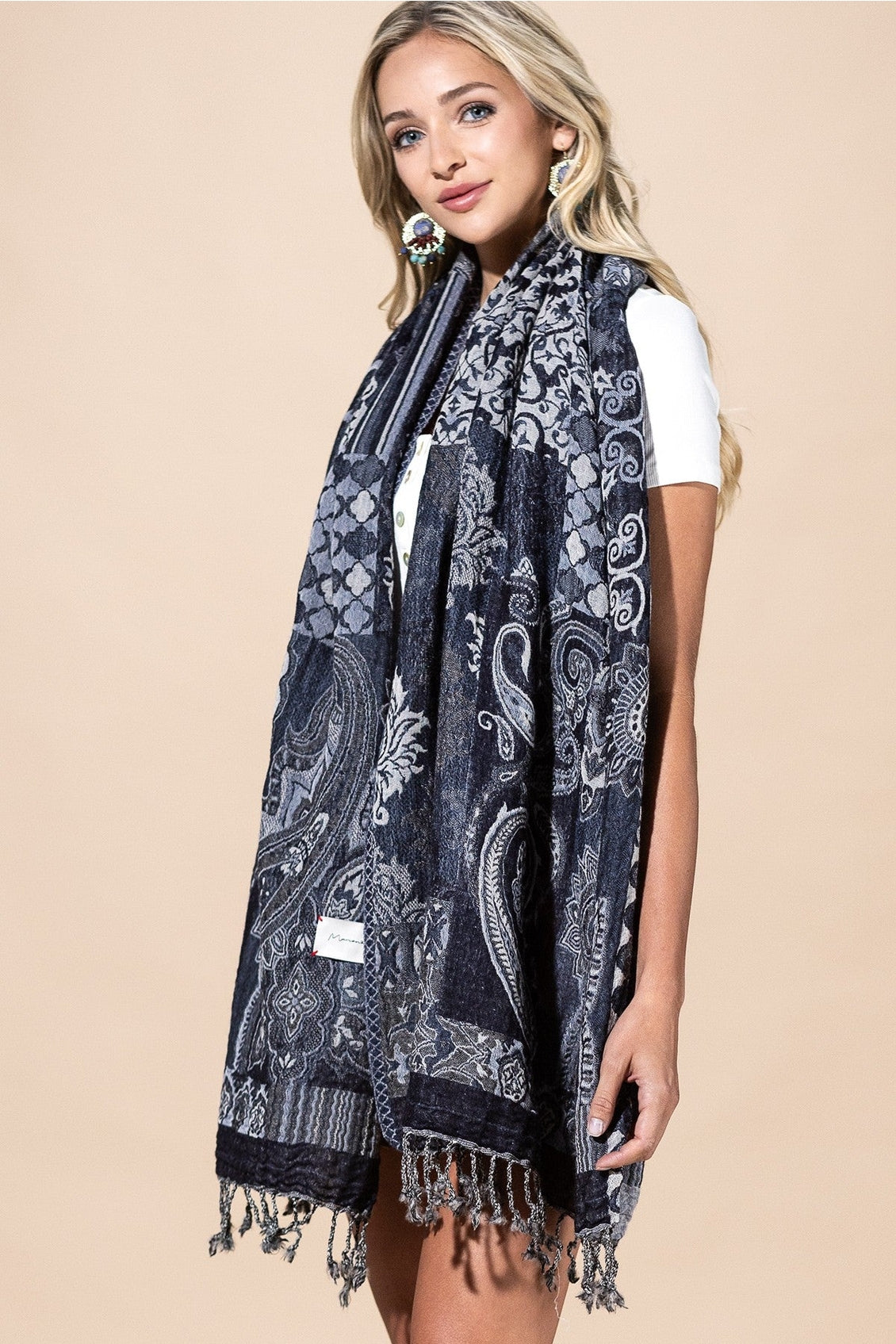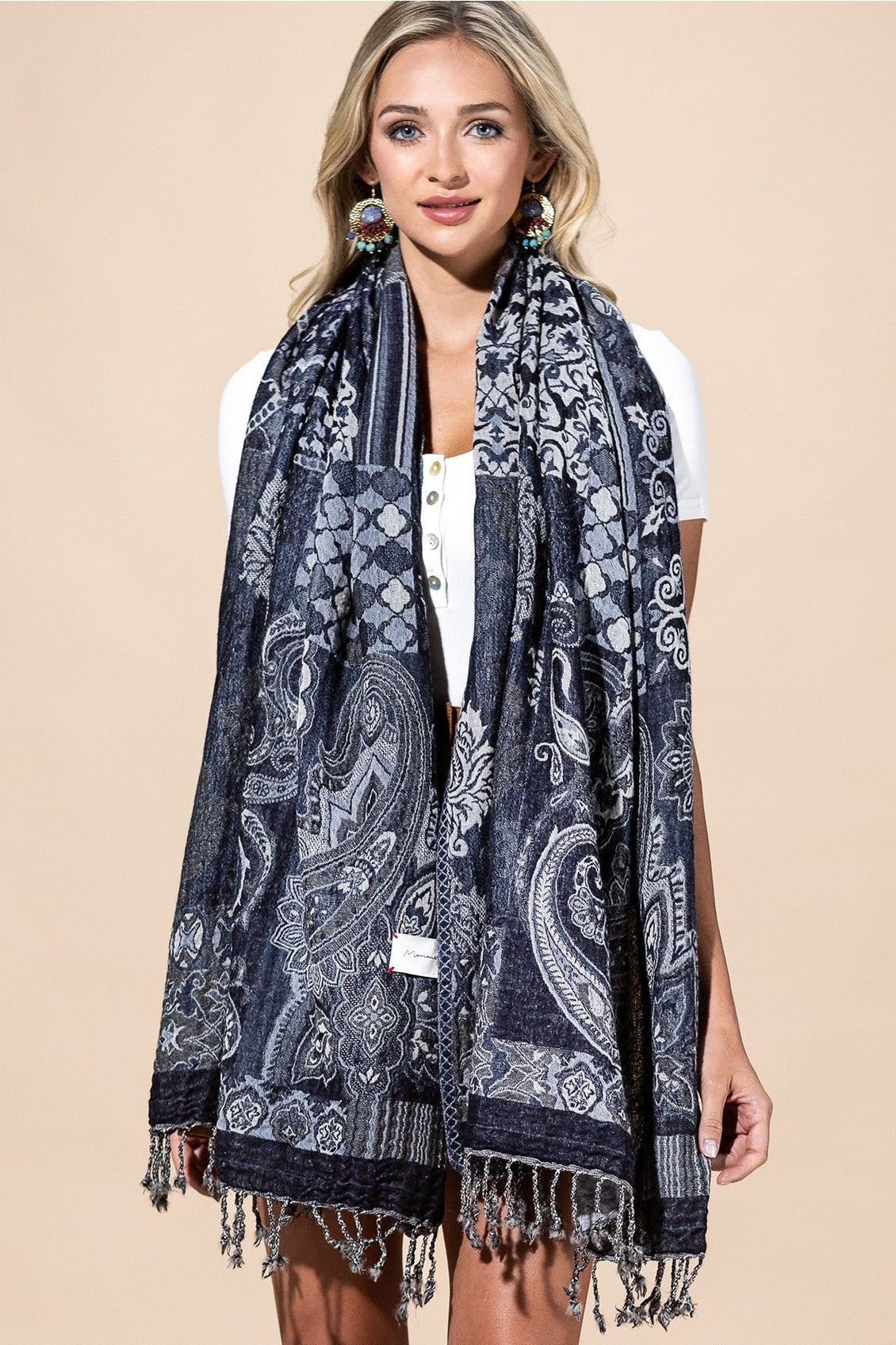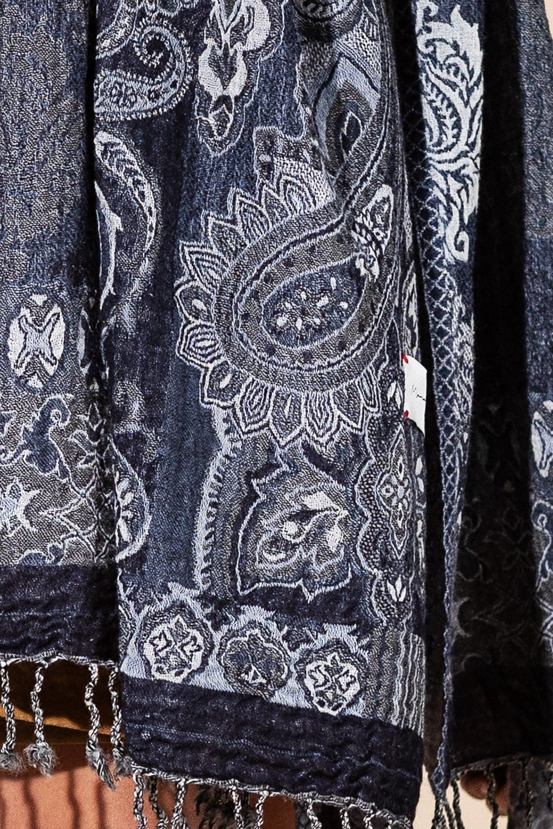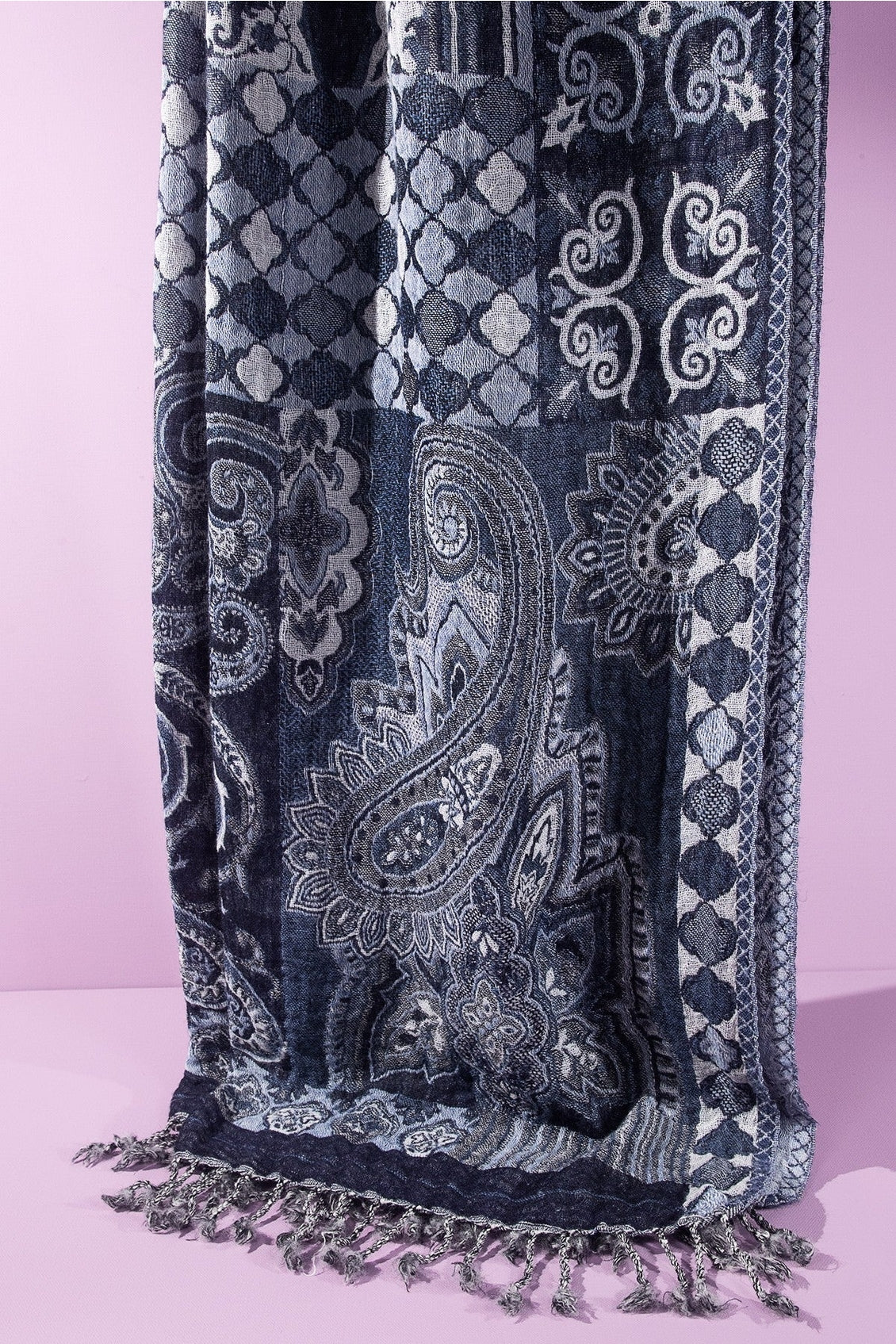 Elevate your everyday style with our paisley motif scarf, a handcrafted, artisan-made accessory created from 100% wool. Featuring a sophisticated blend of deep navy and soft grey tones, this scarf showcases intricate paisley and floral patterns with a subtle geometric border and delicate fringe finish