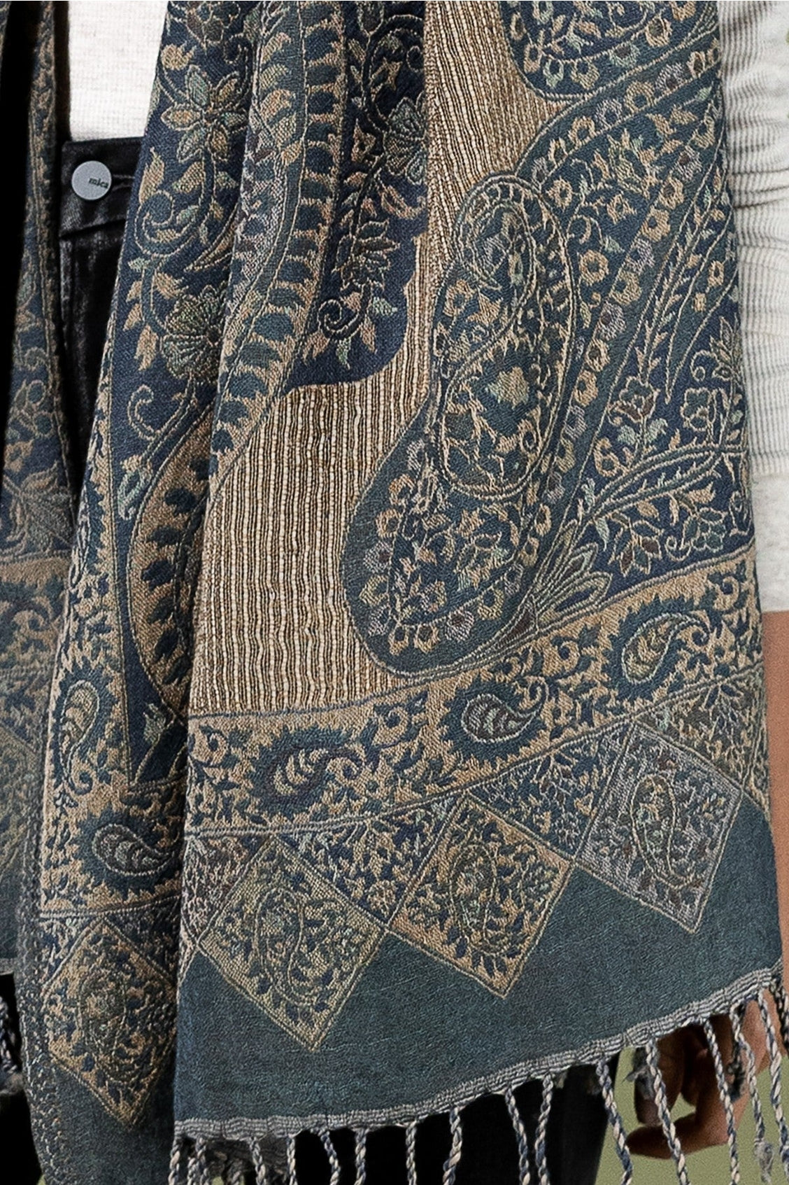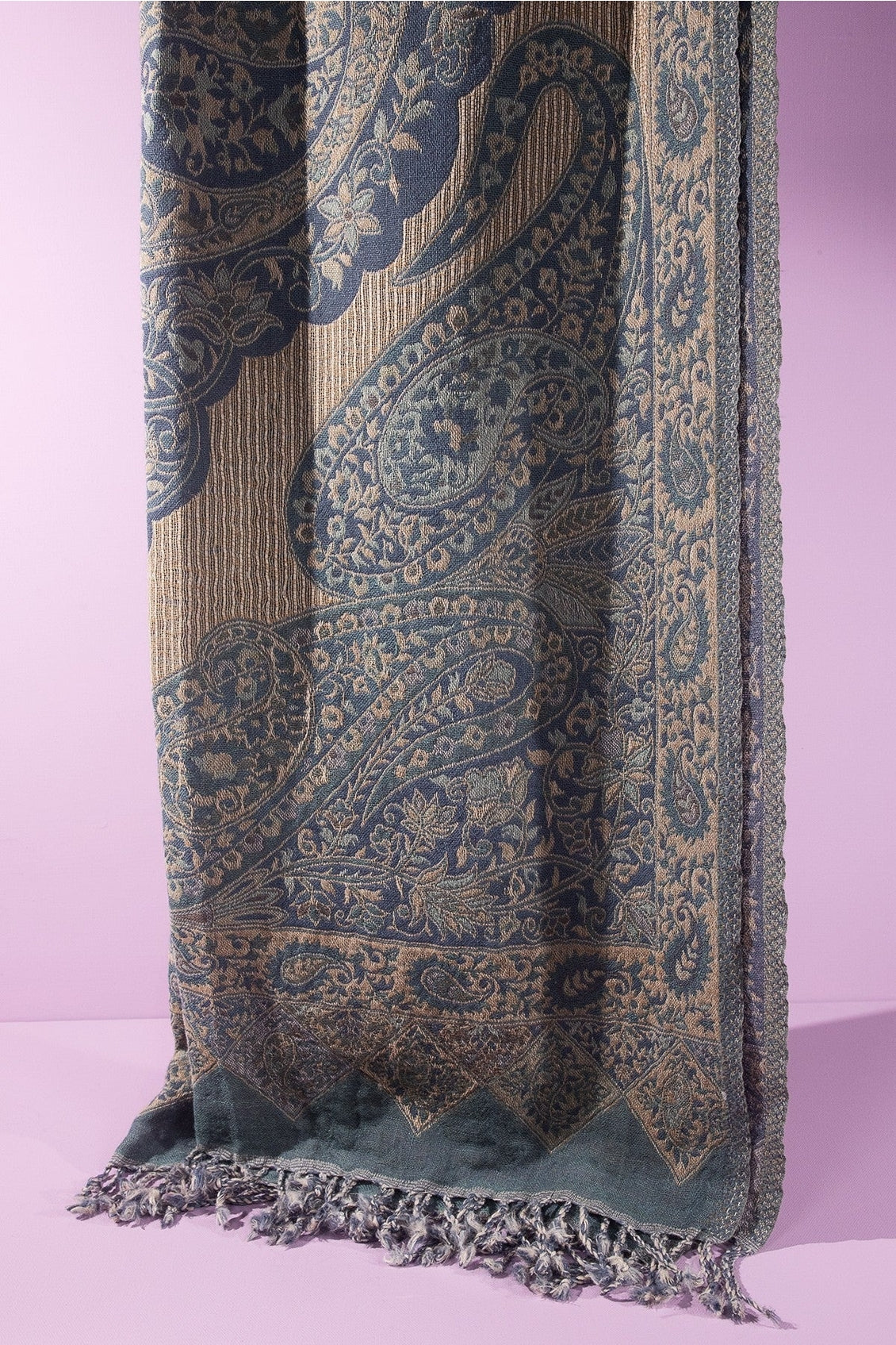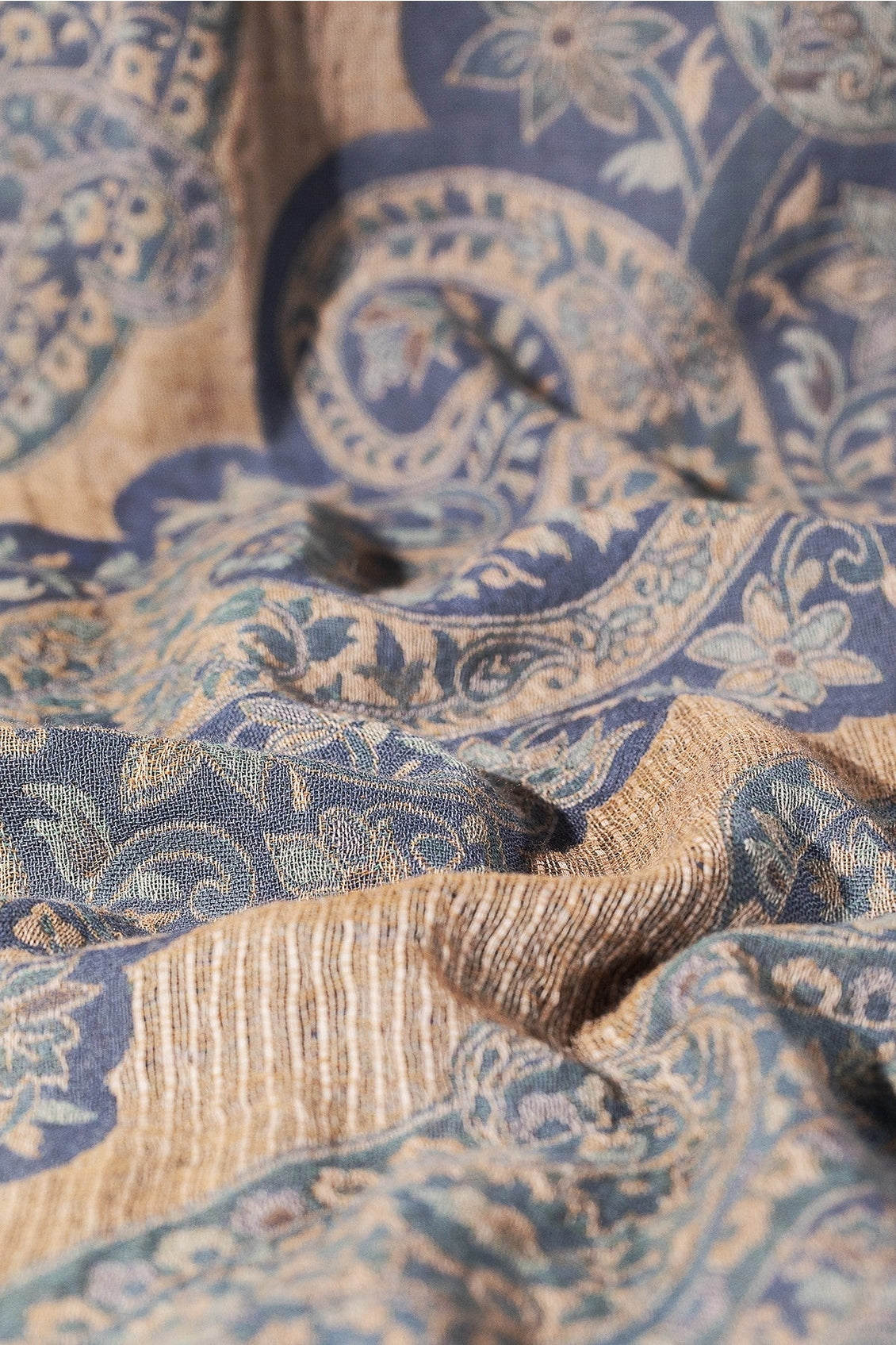 This handcrafted 100% wool scarf is an artisan creation that blends timeless design with modern versatility. Woven in a rich jacquard style, it features flowing paisley and floral motifs in deep midnight blue and warm bronze tones. The intricate patterns are framed by a decorative border, while the hand-finished fringe adds character and authenticity. Both warm and lightweight, this artisan piece offers a refined balance of tradition and sophistication-ideal for elevating everyday wear or complementing special occasion looks.