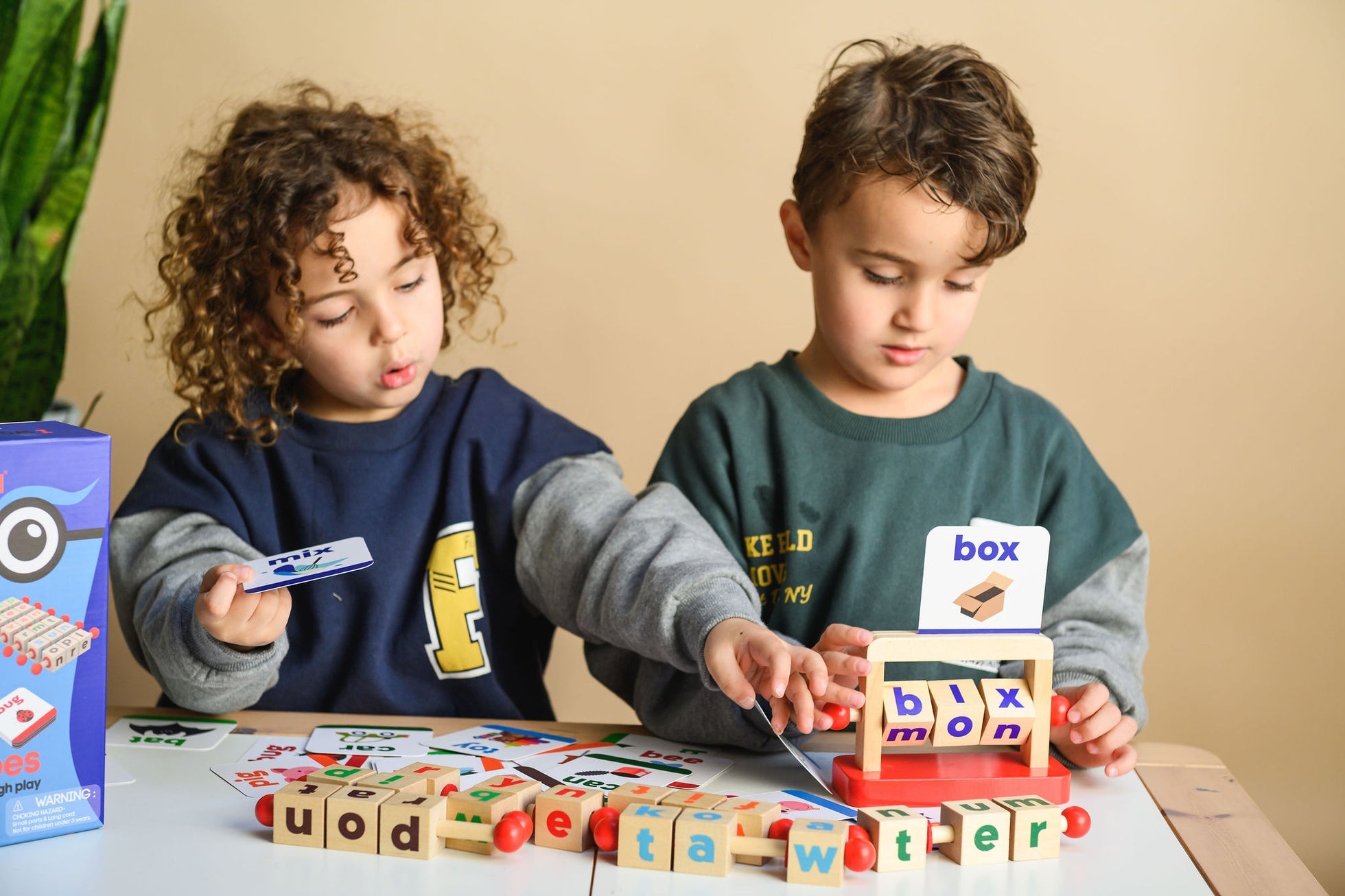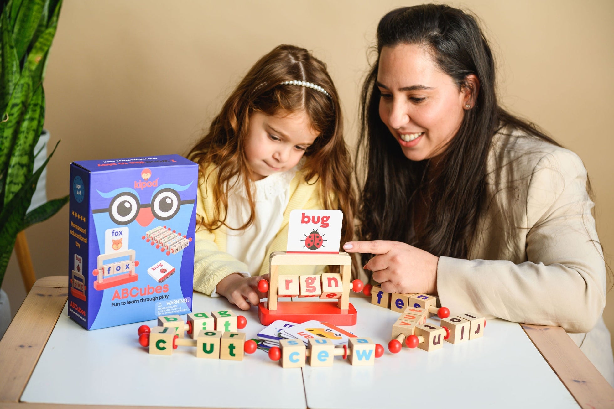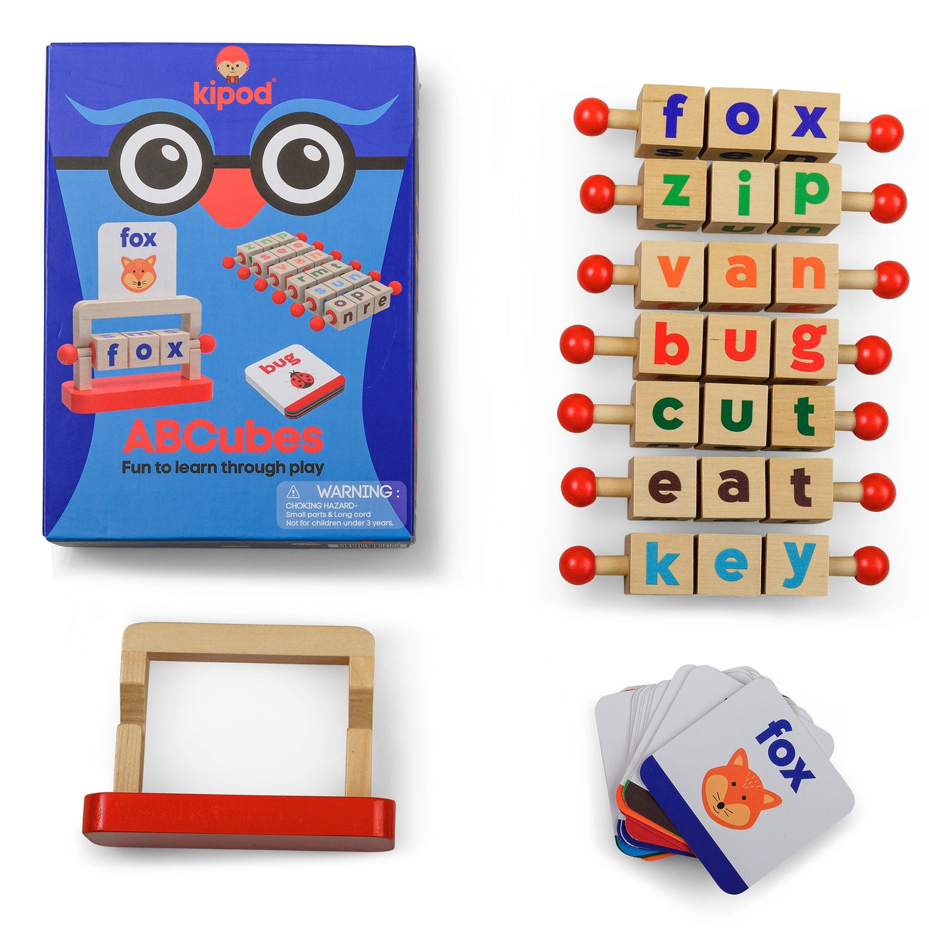 Make learning the alphabet fun and hands-on with KIPOD ABCubes! This beautifully designed set includes 7 rotating wooden letter bars, a sturdy wooden stand, and 34 double-sided cards featuring 68 words. Each card is color-coded to help guide letter placement. Kids start by placing a card in front of the stand and then search the letter bars to find and align the correct letters—building the word shown. This engaging process supports early literacy, letter recognition, and fine motor development in a playful, screen-free way. With its smart design and high-quality materials, ABCubes transforms early reading into an interactive and rewarding experience.