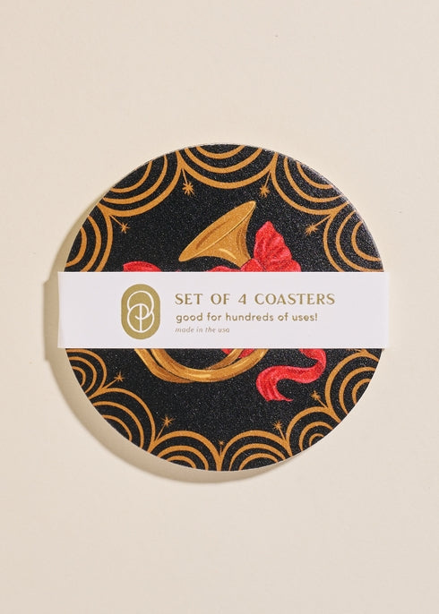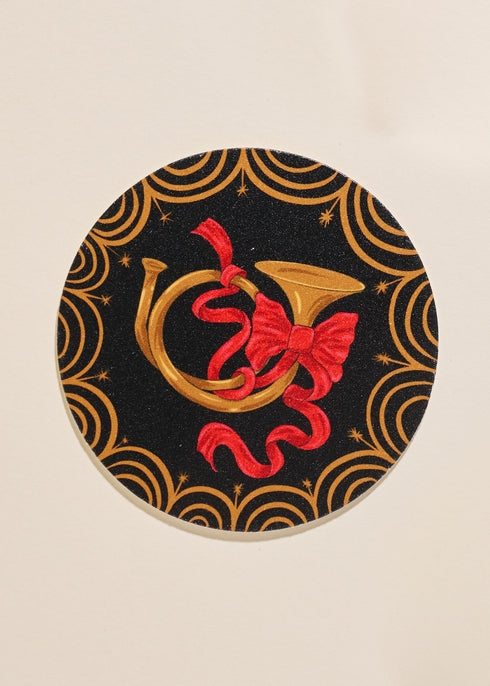 This charmingly illustrated bugle coaster with a festive bow - so on trend! - is ideal for holiday parties.